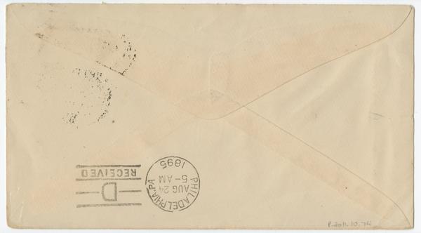 Contains on verso: ink-stamp postmark: received Philadelphia, PA, Aug 24, 1895 5AM. |