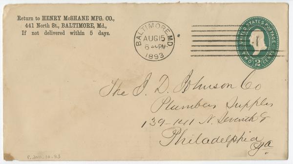 Return address printed in upper left corner: REturn to Henry McShane Mfg. Co., 441 North St., Baltimore, Md. If not delivered