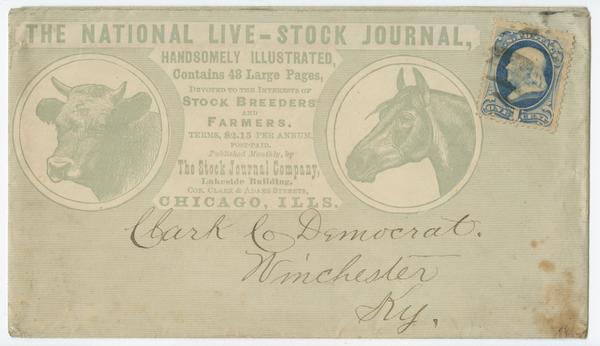 Pictorial envelope containing vignettes of live stock on recto and verso. Vignettes on recto depict oval-framed images of