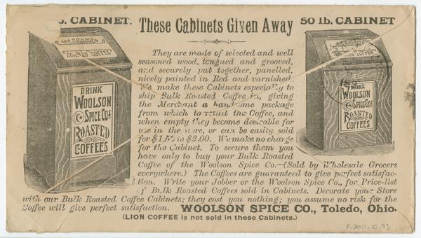 for shipping "bulk Roasted Coffee" adorned with signage reading "Drink Woolson Spice Co.'s Roasted Coffee." Verso also contains