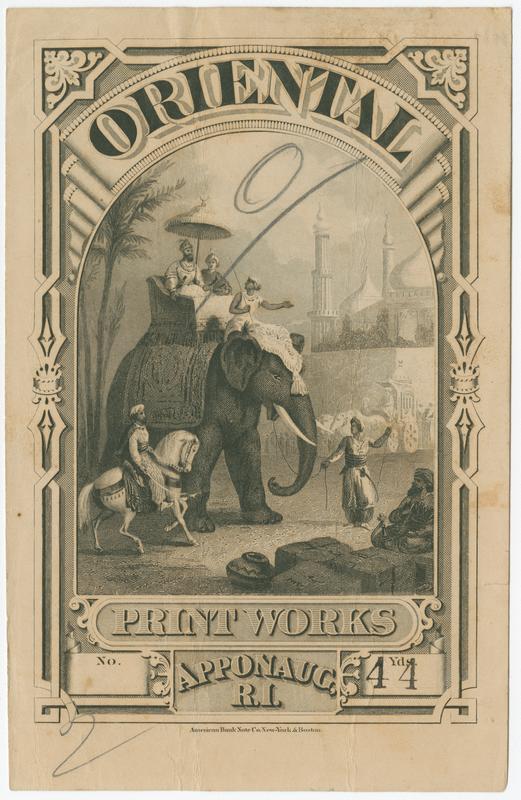 Textile label showing a scene in India. Shows a prince transported by elephant and attended by a guard armed with a sword and on horseback. A driver (mahout) rides on the neck of the elephant that is also guided by another man servant. Also shows a man smoking a hookah, an ox-driven carriage, and majestic, domed buildings. Alfred Reed and Albert Boit established the Oriental Print Works circa 1857 in Apponaug Village in Warwick, Rhode Island. The firm ceased operations in 1883.