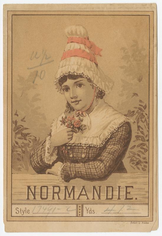 Textile label showing a half-length portrait of a girl in traditional Normandy costume. She holds a small bouquet of flowers
