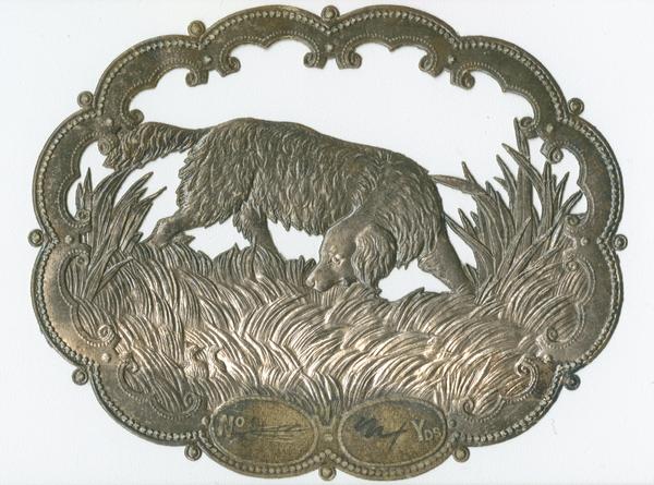 [Textile label depicting a dog spotting two ducks among tall grasses] [graphic].