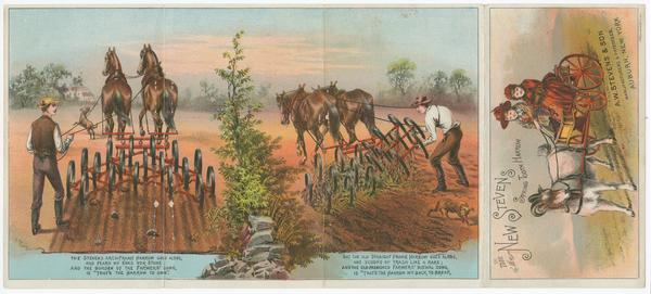 not using a "Stevens Arch-Frame Harrow." Scenes separated by a pictorial detail of shrubbery and stones. In the left, a strident