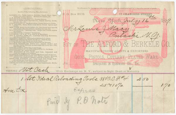 Completed in manuscript to Mr. Lewis J. Macy, Pulaski, N.Y. on July 16, 1889 for 1 set ideal reloading tools 38 W.C.F. #4, 2.50. 25 @ 10%: 1.70.