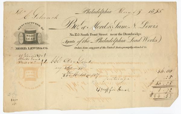 Billhead containing a vignette captioned "Manufactured by Mord. Lewis & Co. and showing barrels of lead labeled "White Lead"; "Red Lead"; and "Mord. Lewis & Co., Philada." Mordecai and Samuel N. Lewis began operation of a white leads manufactory in 1819.