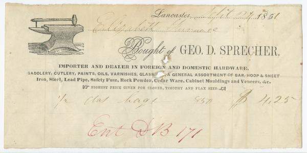 Bought of Geo. D. Sprecher, importer and dealer in foreign and domestic hardware, saddlery, cutlery, paints, oils, varnishes, glass &c. A general assortment of bar, hoop, & sheet iron, steel, lead pipe, safety fuse, rock powder, cedar ware, cabinet moldings and veneers, &c. [graphic]: Highest Price Given For Clover, Timothy and Flax Seed.
