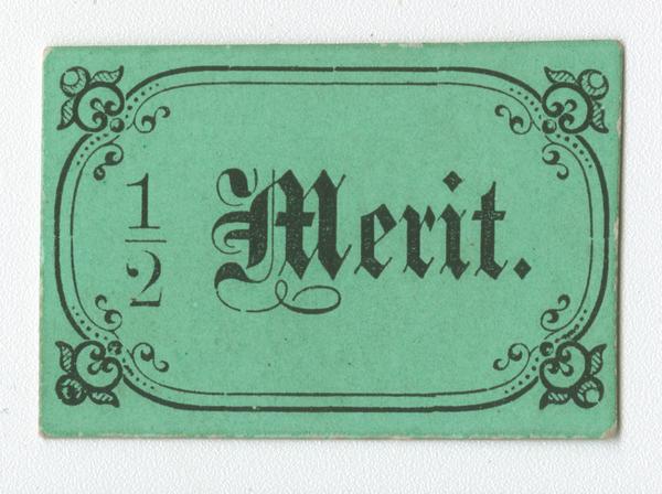 Reward of merit cut from sheet of merits typically accumulated by students to be redeemed for a larger certificate or fancy