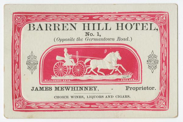 Trade card for the inn, later known as General Lafayette Inn, containing an embossed image of a man driving a horse-drawn buggy. Also contains a decorative border. Mewhinney operated the inn, first called Barren Hill Hotel in 1869, from 1874 to 1895.
