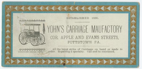 Yohn's carriage manufactory, cor. Apple and Evans streets, Pottstown, Pa. [graphic] : Established 1835. All the latest styles of carriages on hand or made to order. Repairing a specialty. Call and be convinced.