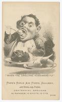 Trade card for the Boston pistol manufacturer containing a comic image titled "When the Swallows Homeward Fly." Shows a man, a bib at his neck, eating from plates with a roast and a whole chicken. The large-eyed man places a spoon of food into his very wide mouth. Also contains an image of a $5.00 "Pope's Rifle Air Pistol," advertising text, and "A Few of the Many Testimonials" printed on the verso. Advertising text includes details about the adjustable gun stock, ease of loading for a "lady or boy," and additional paraphernalia (darts, slugs, and ramrod claw wrench). Albert Pope established Pope Manufacturing Company circa 1865.