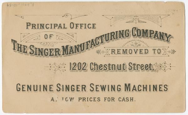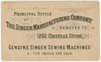 Advertising text printed on verso: Principal Office of The Singer Manufacturing Company Removed to 1202 Chestnut Street. Genuine