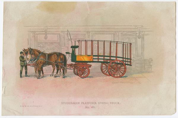 Trade cards containing views of "Studebaker Platform Spring Truck. No. 281." and "Studebaker Platform Spring Coal Wagon. No.