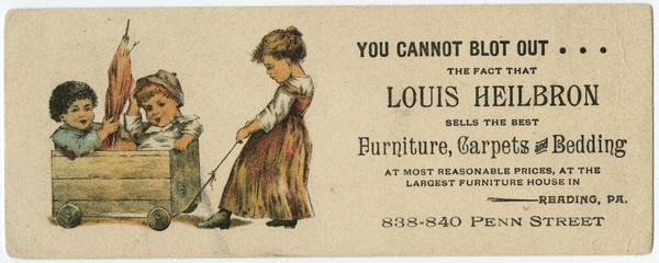You cannot blot out...the fact that Louis Heilbron sells the best furniture, carpets, and bedding at most reasonable prices, at the largest furniture house in Reading, Pa. 838-840 Penn Street [graphic].