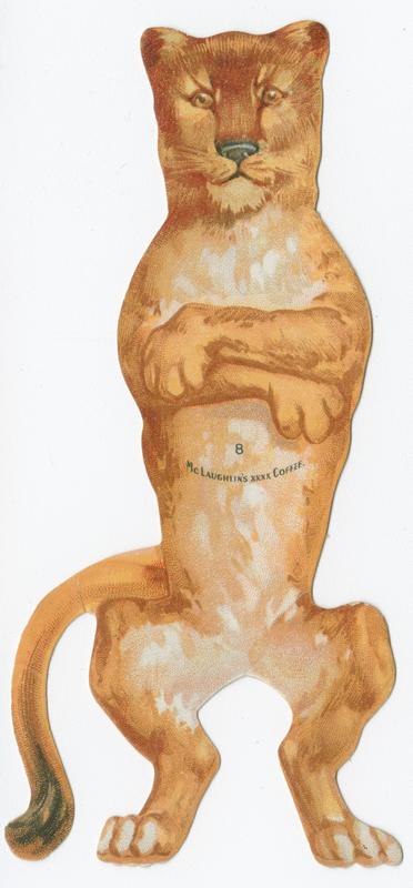 Includes cut-out paper doll figure "8" depicting a tiger and separate die cut costume, probably from the Chicago coffee company's