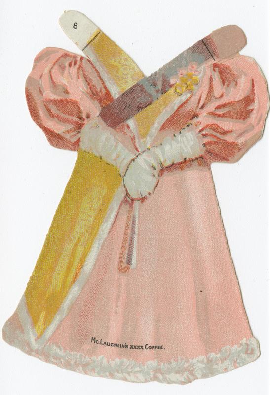 holding a closed fan. McLaughlin Coffee, established in 1852, introduced lines of promotional paper dolls following the Columbian