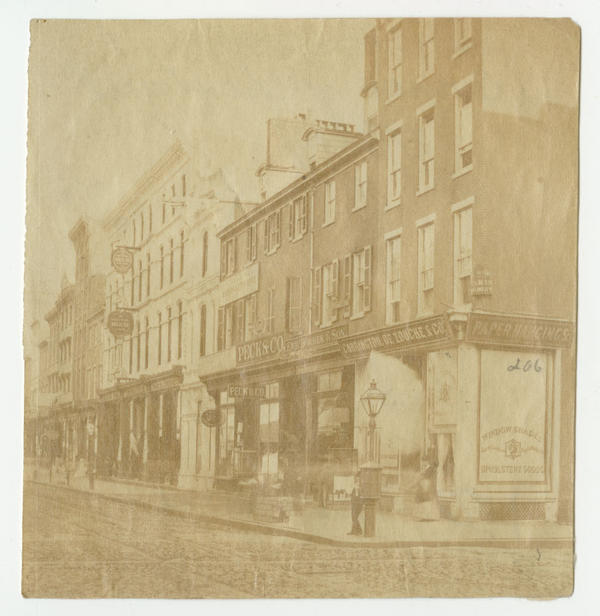 View showing the south side of the 1200 block of Chestnut Street. Businesses include: Lacey & Phillips, saddlery and harnessmaker (1220 Chestnut); Reeve L. Knight & Son, carpets (1222 Chestnut); T.L. Jacobs & Co., shirt manufacturers (1226 Chestnut); Peck & Co., druggists (1228 Chestnut); Edward Borhek & Son, opticians (1230 Chestnut); and Carrington, DeZouche & Co., window shades and paper hangings (Chestnut and Thirteenth). Lacey & Phillip's building is adorned with signage advertising the business's awards for excellence. A woman stands in front of Carrington, DeZouche & Co. Also shows a boy leaning on a lamppost and letterbox at the street corner.