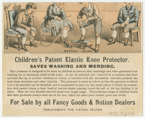 Advertising text promoting "Children's patent elastic knee protector" printed on verso below "before using" image, which folds up to create the complete scene.