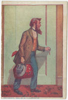 Illustrated humorous trade card depicting a man with a long beard toting a bag and hat in his right hand about to open the