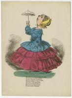 A woman wearing a large and elaborate skirt sticks her nose in the air and carries a comically small parasol. The valentine chides her for having an inflated opinion of her own beauty and style.