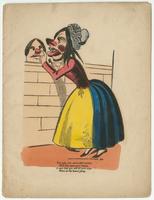 A woman with a large nose and oversized tongue gossips with a neighbor over a wall.