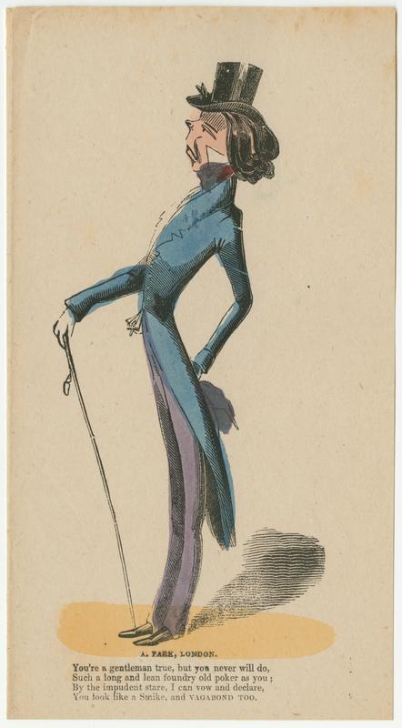 A man wearing a top hat, frock coat and gloves carries a cane. The valentine suggests that his attention to dress does not succeed in making him attractive.