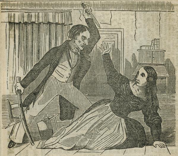[Lucian Hall threatening Mrs. Lavinia Bacon with a large knife]