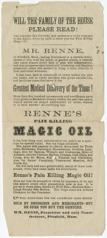 [Materials relating to Renne's Pain Killing Magic Oil, manufactured and marketed by Wm. Renne & Sons, of Pittsfield, Mass.] |