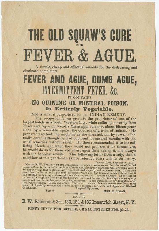 [1] The Old Squaw's Cure for Fever & Ague, one testimonial dated Sept. 1871; with MS. notes on verso by a women, "Diary of one day, not a 'busy' one. September 14, 1887" -- [2] Robinson's Emulsion of Cod Liver Oil with hypophosphites of lime and soda, sold by A.C. Mabie, Sparkill, N.Y. -- [3] Sol-San-Dis (Soluble Sanitary Disinfectant), one testimonial dated Sept. 8, 1890.