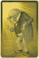 Advertisement for the Antikamnia Chemical Company established around 1890. Depicts the skull-headed company icon "Funny Bones," wearing glasses, attired in a suit, and holding an "AK" tablet in his hand, and shrugging. Antikamnia (opposed to pain) was a toxic and addictive medicine often mixed with codeine and quinine. Funny Bones was designed by pharmacist and doctor Louis Crucius.