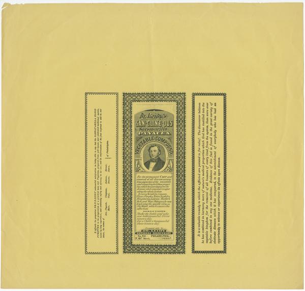 Label for druggist and patent medicine dealer Dr. N. B. Leidy. Comprised of three sections within ornamented borders. Front section includes a vignette portrait of Leidy and directions for use. Side sections include promotional text and names of professional endorsers. Leidy operated a drug dispensary from the 1840s to late 19th century. Leidy operated from North Sixth Street by 1880.