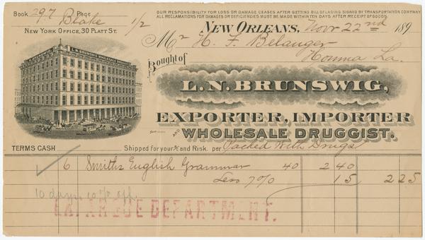 [Billheads of L. N. Brunswig, exporter, importer and wholesale druggist, New Orleans, La.] [graphic]. |