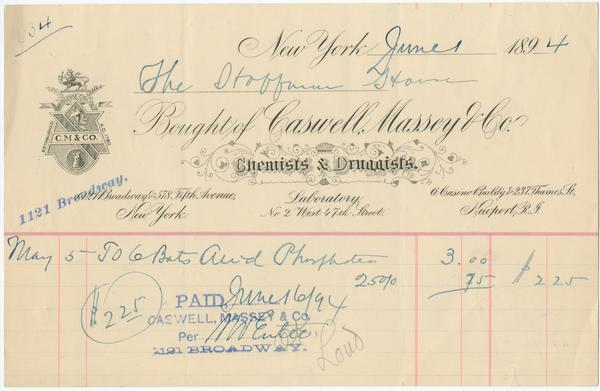 Paid: June 16, 1894 Caswell, Massey & co. Per N.W. Emlee, 1121 Broadway.