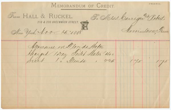 and McAllister's All-Healing Ointment. Memorandum also contains a pictorial detail depicting a mortar and pestle. Hall & Ruckel,