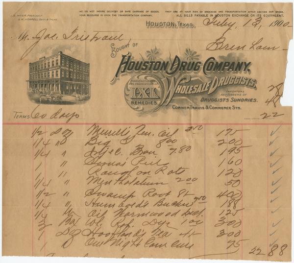 P.2011.46.166 completed in manuscript to druggist Jos. Tristram, Brenham on July 13, 1900 for several items, including Swamp
