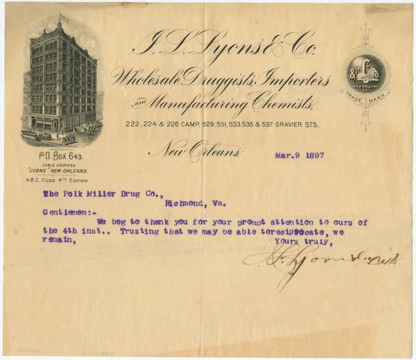 P.2011.46.176 completed in type to the Polk Miller Drug Co., Richmond, Va. from J.L. Lyons & Co. Betts on March 9, 1897 requesting
