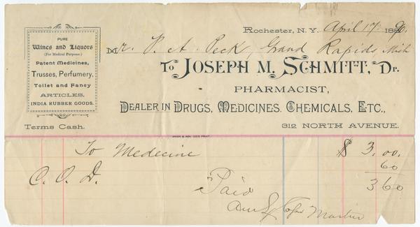 P.2011.46.230 completed in manuscript to F. A. Peck, Grand Rapids, Michigan on April 17, 1890 for "To Medicine" for $3.60. Also contains manuscript note on recto: C.O.D. Paid [Illegible] Martin.