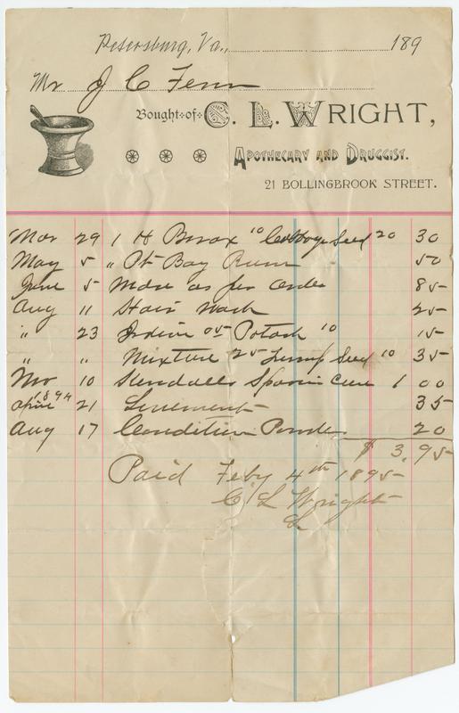 Bought of C. L. Wright, apothecary and druggist, 21 Bollingbrook Street. [graphic].