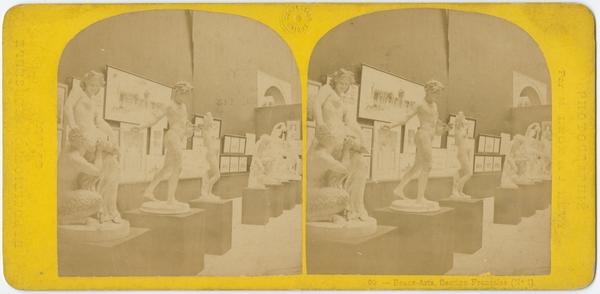 View of displays of French fine art, including sculpted nudes and framed works. The sculptures rest on pedestals and the prints are hung one on top of the other. The exposition held April 1-November 3, 1867 celebrated the technological and economic progress of the Second Empire, as well as originated the classification system followed by proceeding international exhibitions.