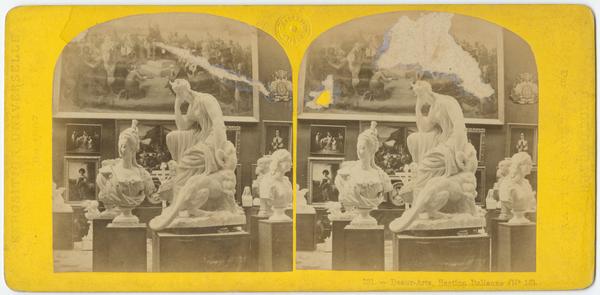 View of Italian fine art on display, including sculpture and framed paintings. Sculpture includes busts and the paintings depict portraiture and religious scenes. The exposition held April 1-November 3, 1867 celebrated the technological and economic progress of the Second Empire, as well as originated the classification system followed by proceeding international exhibitions.