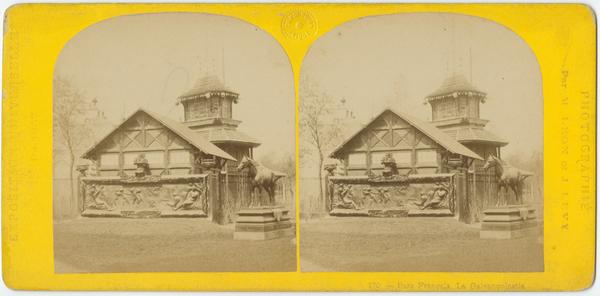 View of a display of galvanoplastic, i.e., electroformed architectural and ornamental sculpture. Shows a house-like structure adorned with a bas-relief frieze and horse statuary. The exposition held April 1-November 3, 1867 celebrated the technological and economic progress of the Second Empire, as well as originated the classification system followed by proceeding international exhibitions.