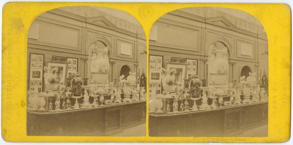 Shows an exhibit of Prussian porcelain on a cabinet-like pedestal. Includes vases, urns, and pedestal. Also shows signage for photographer "Gustav Schauer, Berlin" and framed displays of his work on the wall in the background. Other brass works surround the pieces, including a clock, lamps, and objets d'art. The exposition held April 1-November 3, 1867 celebrated the technological and economic progress of the Second Empire, as well as originated the classification system followed by proceeding international exhibitions.