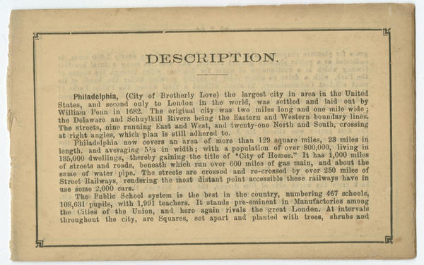 Includes 15-page "Description" of Philadelphia and major landmarks in Boston and Washington, D.C. Description missing pages. |