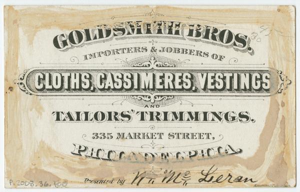 Advertising text printed on verso: Goldsmith Bros. Importers & Jobbers of Cloths, Cassimeres, Vestings and Tailors Trimmings.