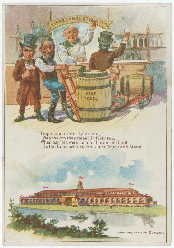 a barrel of it on an Enterprise barrel jack, truck and stand (i.e., dollie). A "Tippecanoe & Tyler Too" banner is displayed