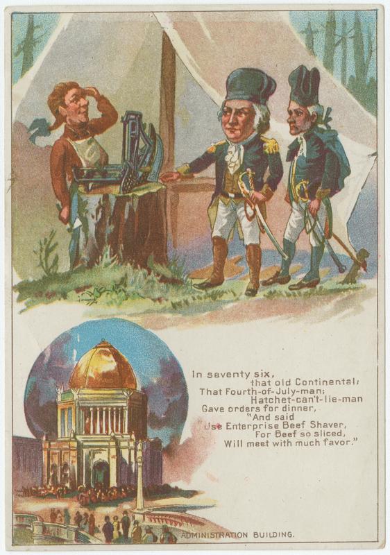 Trade card issued during the Columbian Exposition of 1893 advertising Enterprise Mf'g Co. of Pa. "Enterprise Smoked Beef Shaver."