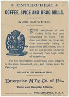 Advertising text printed on verso: Enterprise Coffee, Spice and Drug Mills. 24 Sizes-$1.25 to $100.00. The excellence of our