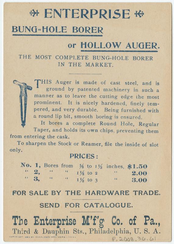 Advertising text printed on verso: Enterprise Bung-Hole Borer or Hollow Auger. The Most Complete Bung-Hole Borer in the Market.