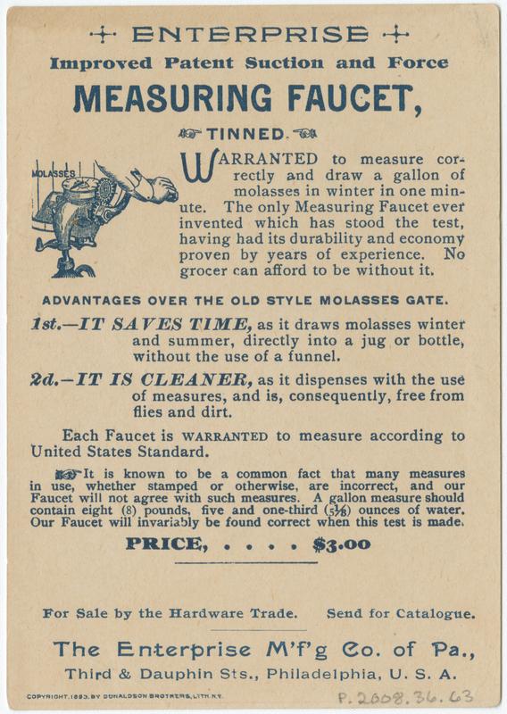 Printed on verso: For Sale by the Hardware Trade. Send for Catalogue. The Enterprise M'f'g Co. of Pa., Third & Dauphin Sts.,