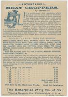 Several lines of advertising text printed on verso. Text promotes the excellence of the "Enterprise Meat Choppers" in not